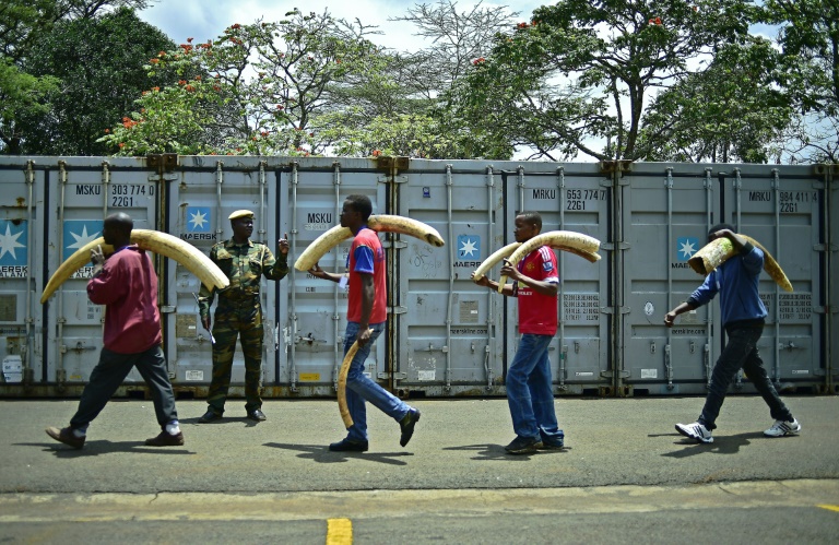 Confiscated ivory is moved to secure containers from an ivory stock room at the Kenyan Wildlife Services headquarters in Nairobi.-AFP