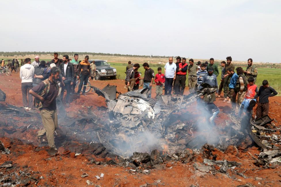 Rebel fighters and civilians gather around the wreckage of a Syrian warplane that was shot down in Talat al-Iss area South of Aleppo, Syria on Tuesday.