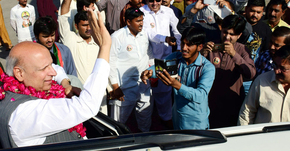PTI leader, Chaudhry Muhammad Sarwar waving hand to party workers.