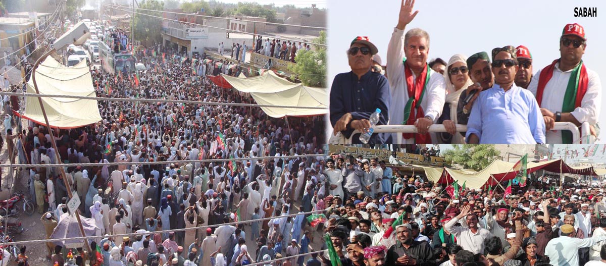 PTI Central Leader Shah Mehmood Qureshi replying to the slogans of people by waving his hand  in Pannu Aqil on Saturday.