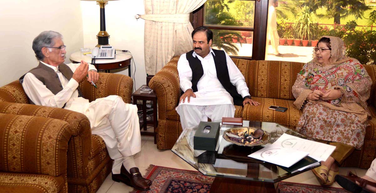 CM KPK Pervez Khattak chairing a consultative meeting with Senior Minister for Irrigation Sikandar Sherpao and Minister for Mineral Development Anesa Zaib Tahirkhaili in Peshawar on Thursday.