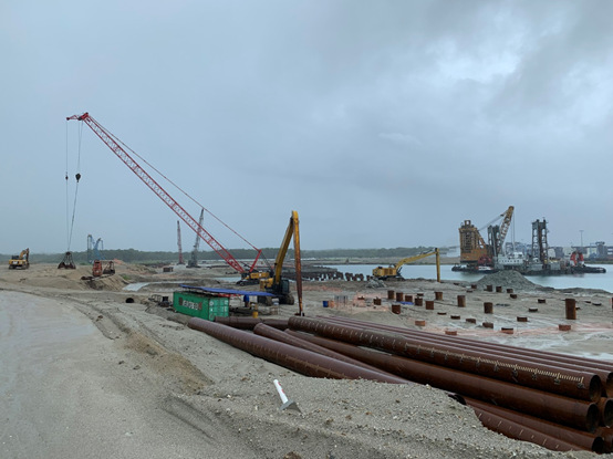 At a construction site at the estuary of Panama Canal to the Atlantic Ocean, growling gigantic marine equipment, caterpillar cranes, portal cranes and a 27-meter-long high-front shovel from Chinaare busy with the expansion project of Margarita Island port.