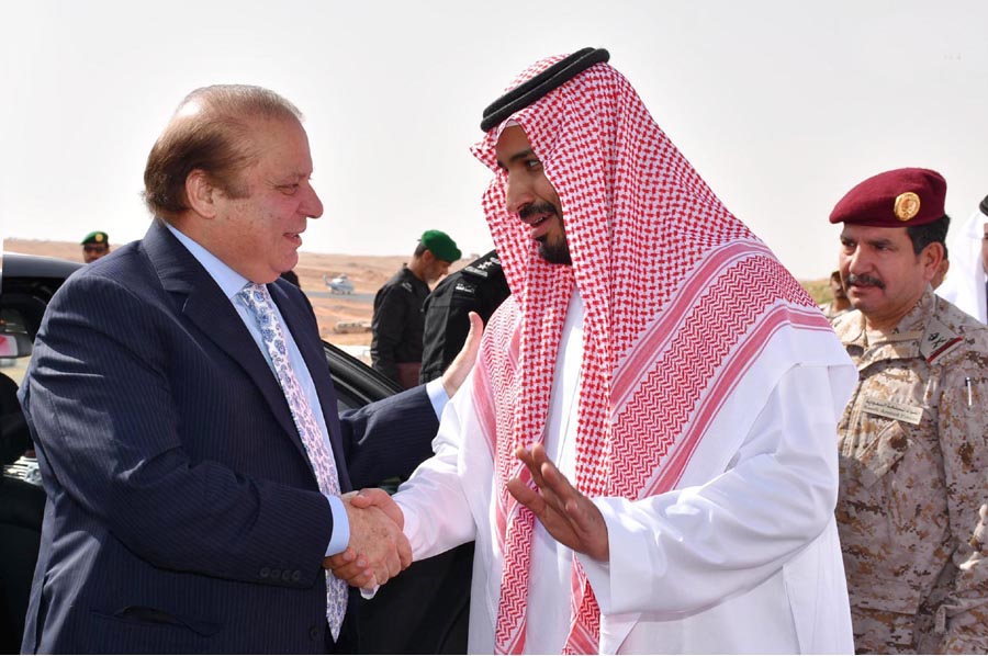 Prime Minister Muhammad Nawaz Sharif being received by Defence Minister of Saudi Arabia Prince Muhammad Bin Saleman at the venue of North Thunder Joint Military Exercise  at Hafar ul Batin, Saudi Arabia on Thursday.