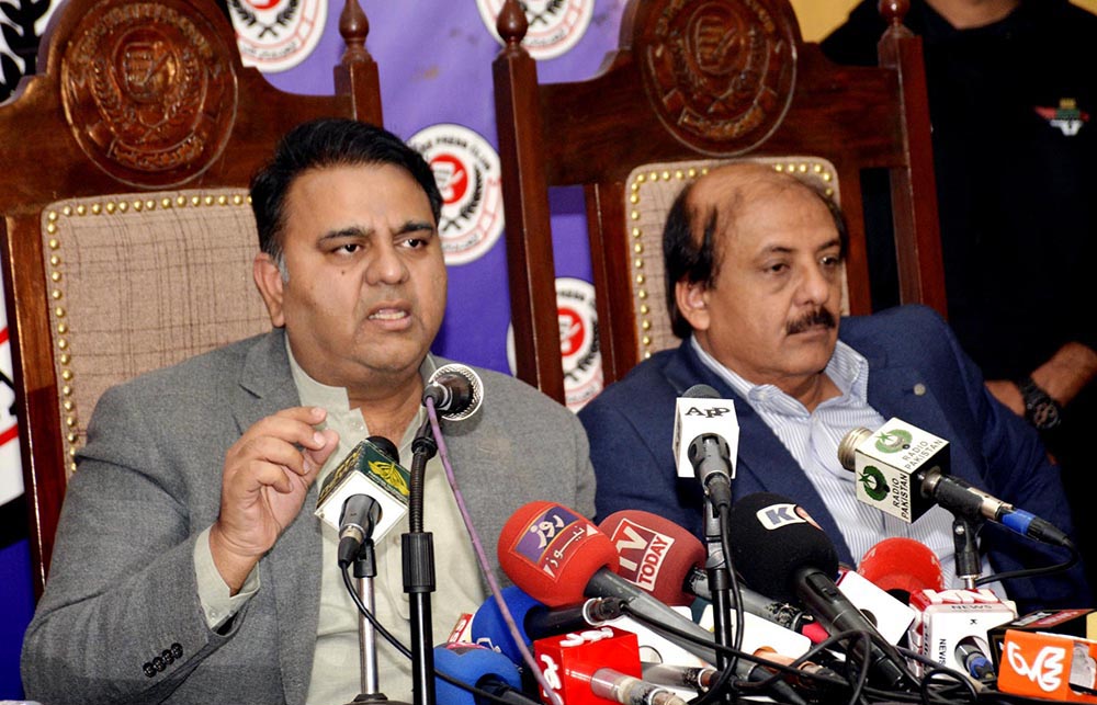 Fawad Chaudhary, Federal Minister for Information and Broadcasting talking to media in Lahore on Monday.
