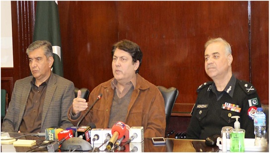 SACM KPK on Information, Barrister Muhammad Ali Saif, KPK Chief Secretary, Shahzad Khan Bangash and Inspector General Police, Moazzam Jah Ansari are giving a briefing about the security during the Polls.