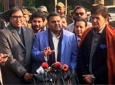 Federal Minister for Information and Broadcasting Fawad Chaudhary and SAPM on Political Communication Dr. Shahbaz Gill jointly talking to media in Lahore on Thursday.