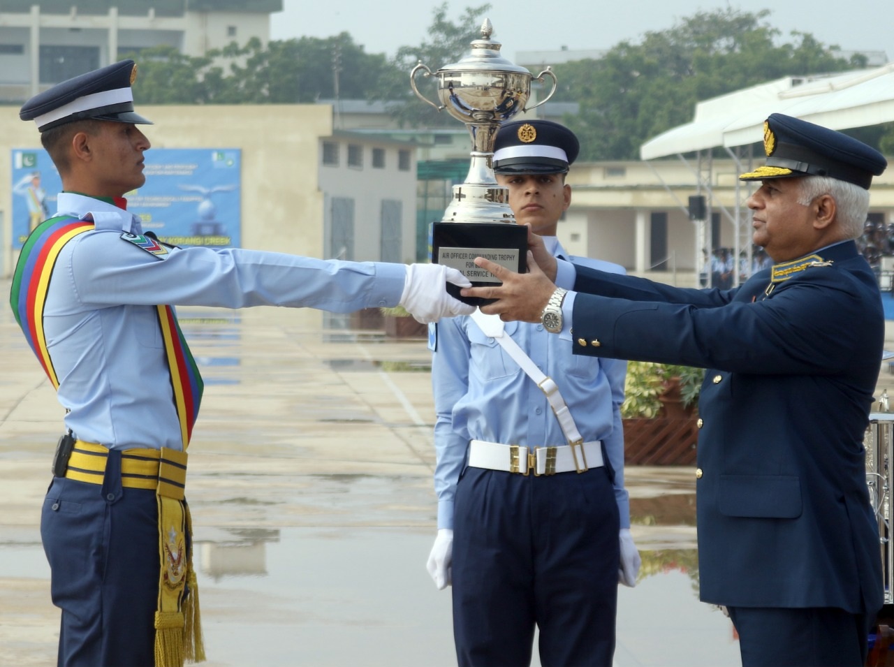 The Chief Guest also awarded trophies to high achievers. Asghar Khan Trophy for the Best in Aeronautics was awarded to AFT-II SherazHussain. Nur Khan Trophy for the Best in Avionics Technology was awarded to Aero Electromech Technician-II MubasharUlHasan. Air Officer Commanding Trophy for the Best in General Service Training was awarded to Academy Sergeant Aircraftman Abdul Raouf Khan, whereas Trophy for best foreign trainee was awarded to LAC Bandhara of Sri Lanka Air Force. Chief of the Air Staff Trophy for the Overall Best Performance was awarded to AC Muhammad Ishtiaq.-PR