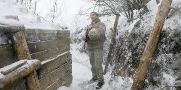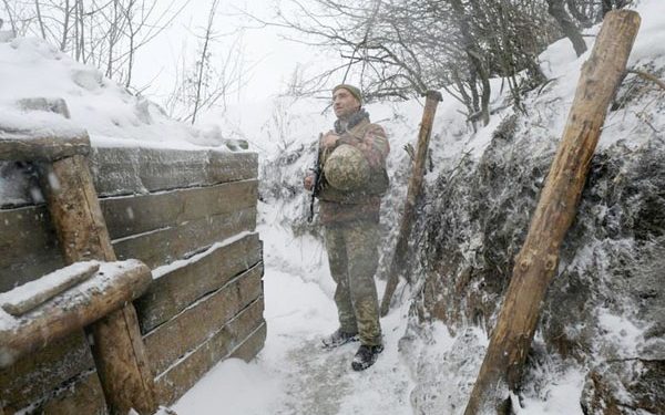 Service member of the Ukrainian armed forces stands guard in a trench at combat positions near the line of separation from Russian-backed rebels outside Krymske in the Luhansk region, Ukraine
