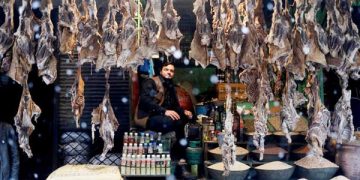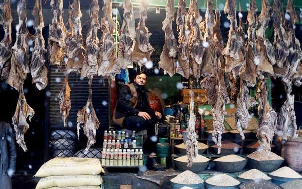 A shopkeeper waits for customers during a snowfall in Kabul, Afghanistan