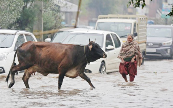 A cow crosses a water logged street after heavy rain in Amritsar district of India's northern Punjab state.