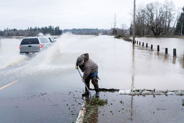 floodwaters threaten his home after heavy rain in Chehalis, Washington, U.S.