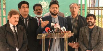 Minister of State for information and Broadcasting, Farrukh Habib addressing a press conference in Islamabd on Tuesday.—NNI