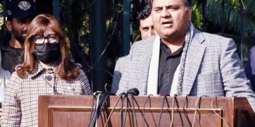 Federal Minister for Information and Broadcasting, Fawad Chaudhry is talking to media in Lahore.
