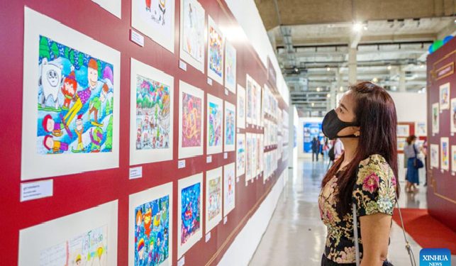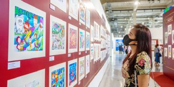 A visitor views paintings at the Ratchadamdoen Contemporary Art Center in Bangkok, Thailand