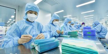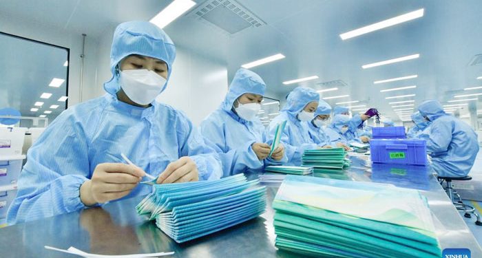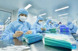 Staff members work at a workshop of Naton Medical Protective Equipment (Tianjin) Co., Ltd. in Tianjin, north China