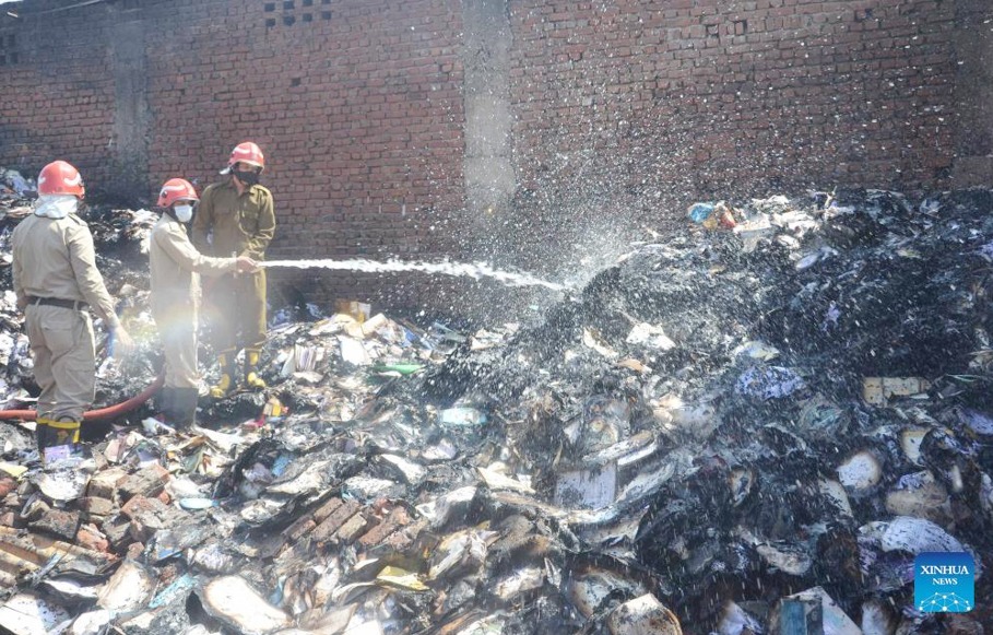 Fire brigade members spray water after a major fire broke out near Gokalpur village in northeast Delhi, India