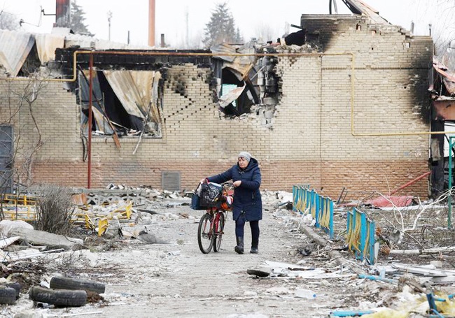 A woman walks with a bicycle next to a building damaged during the Ukraine-Russia conflict in the separatist-controlled town of Volnovakha in the Donetsk region, Ukraine