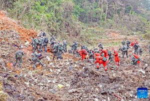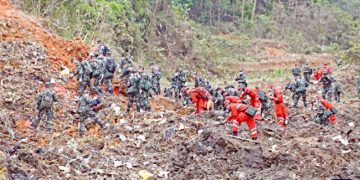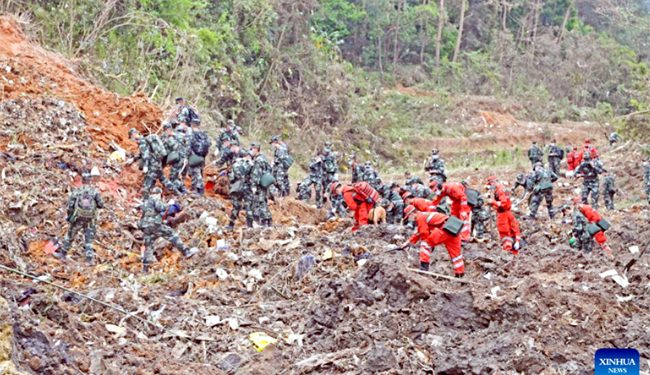 Rescuers search for the black boxes at a plane crash site in Tengxian County, south China's Guangxi Zhuang Autonomous Region. - Xinhua