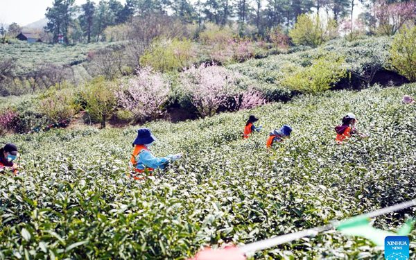 Workers pick tea leaves in a tea garden in Jiangning District of Nanjing, east China's Jiangsu Province