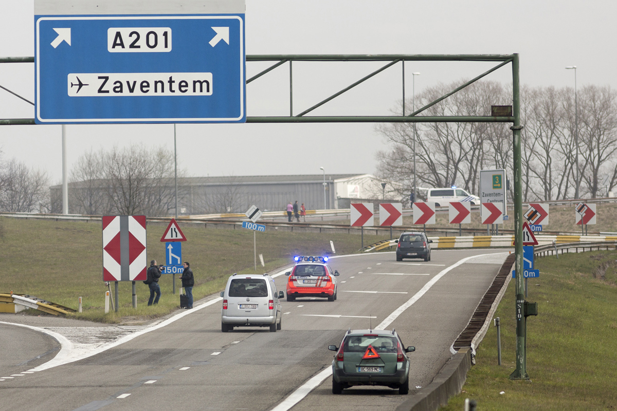 The vehicles are stopped on a road leading to Brussels Airport in the wake of