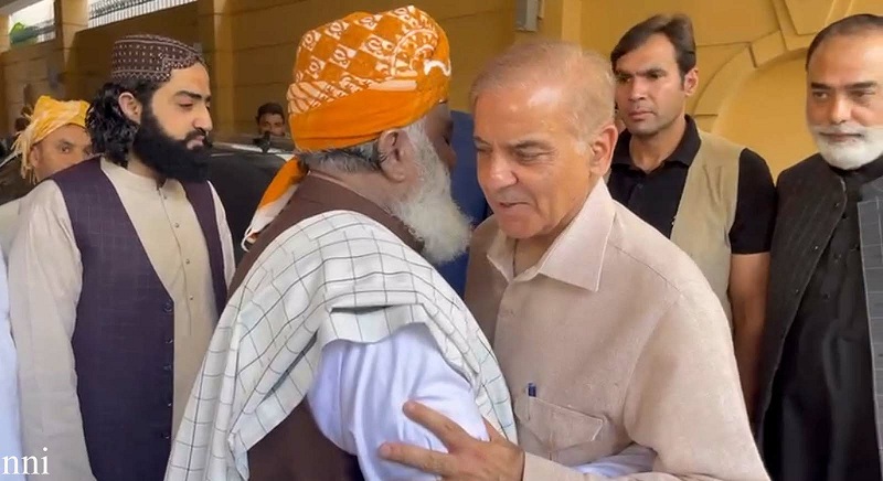 Maulana Fazlur Rehman is welcoming Shehbaz Sharif at his residence in Islamabad