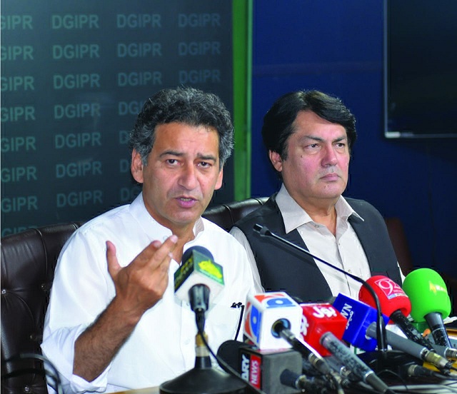 KPK Minister for Food & IT, Atif Khan and SACM KPK on Information & PR, Barrister Muhammad Ali Saif are talking to media on Tuesday.