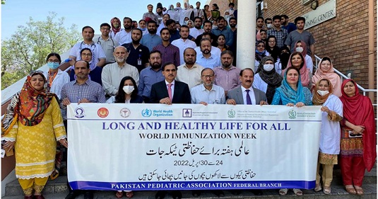 Participants of a walk in a group photo on the occasion of World Immunization Week in Rawalpindi on Tuesday.