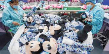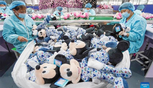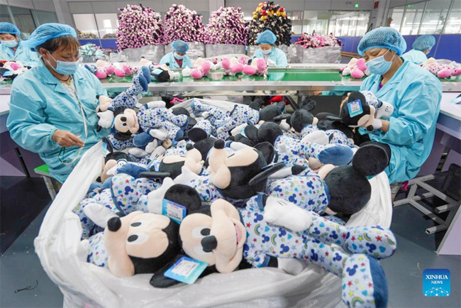 Workers work at a plush toy factory in Jinhuai Village of Yangzhou, east China’s Jiangsu Province
