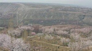 He drove his rundown motorcycle along an old, dry trough, its concrete sections bent and cracked, the cracks stuffed with plastic or cotton. An apricot orchard around him was in full bloom, pink petals falling on the dry soil with sparse leaves of last year’s grass that survived the snowless winter, but is withering without rain.