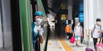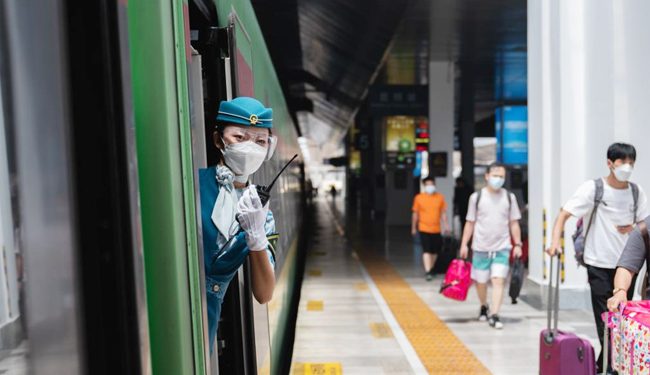 A stewardess of China Railway Kunming Bureau Group Co., Ltd. works on a bullet train in Kunming Railway Station in Kunming, capital of southwest China’s Yunnan Province.