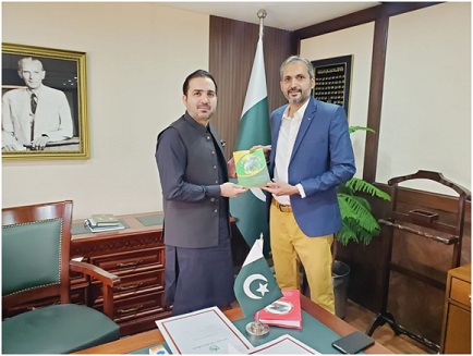 Shakeel Ahmad Ramay, CEO, Asian Institute of Echo-Civlization Research & Development (AIERD) presenting his book ‘Global Development Initiative & Agenda 2030’ to Mirza Muhammad Afridi, Deputy Chairman Senate in Islamabad.