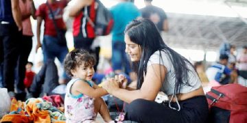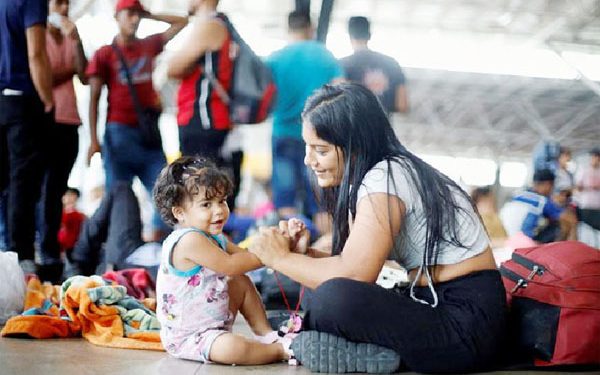 A woman plays with her daughter while waiting with fellow Venezuelan migrants at a bus station for help by Mexican authorities to reach Ciudad Acuna to cross the border to Del Rio, Texas.