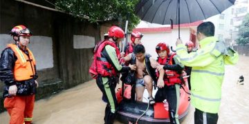 Rescuers evacuate stranded people in flood water in Songxi County of Nanping, southeast China's Fujian Province. - Xinhua