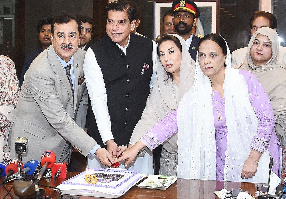 Speaker NA Raja Pervaiz Ashraf cutting the cake of 69th Birth Anniversary of Shaheed Benazir Bhutto at Parliament House.