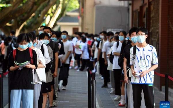 Examinees prepare to enter an exam site of the 2022 senior high school entrance examination in Zhengzhou, central China's Henan Province.