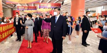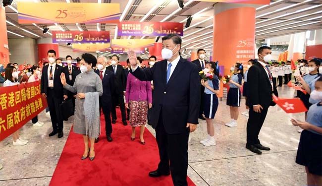 Chinese President Xi Jinping and his wife Peng Liyuan wave to the welcoming crowd upon their arrival in Hong Kong, south China
