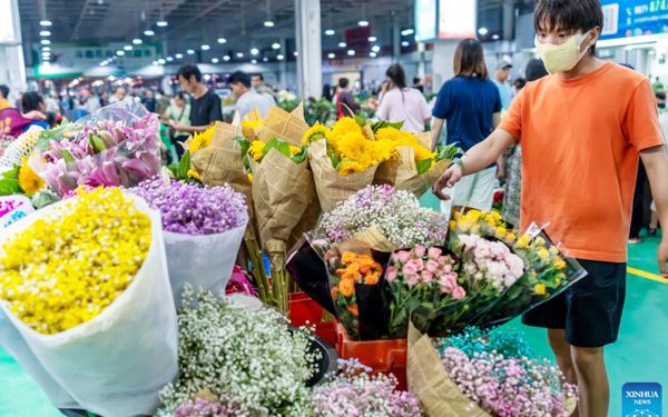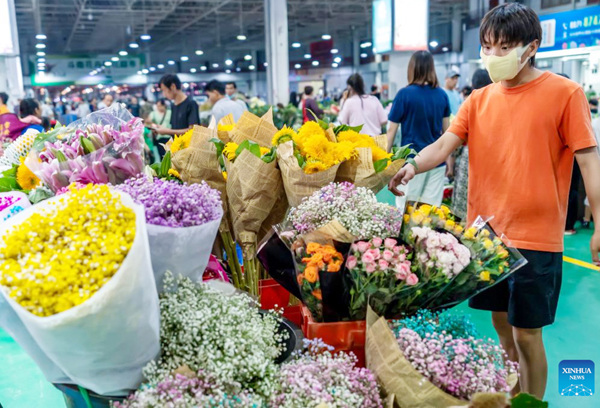 People visit the Kunming Dounan Flower Market at night in southwest China's Yunnan Province