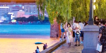 Tourists enjoy themselves alongside the Songhua River in Harbin, northeast China’s Heilongjiang Province