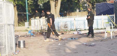 Pakistani police commandos stand guard at the cordoned-off site of the March 27 suicide bombing, in Lahore on March 28, 2016. The toll from a suicide blast in Pakistan's Lahore rose to 69, officials said on March 28, as authorities hunted for the "savage inhumans" behind the attack in a park packed with Christian families celebrating Easter Sunday. More than 200 people were injured, many of them children, when explosives packed with ball bearings ripped through crowds near a children's play area in the park in Lahore, leaving dozens dead or bloodied. / AFP / ARIF ALI        (Photo credit should read ARIF ALI/AFP/Getty Images)