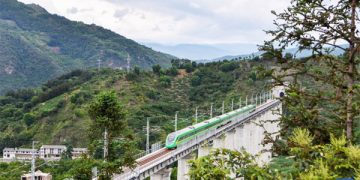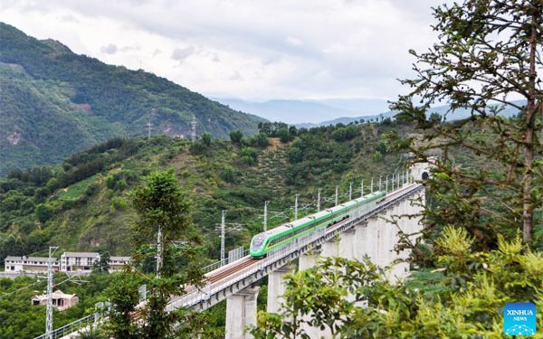 A bullet train runs for trial on a bridge along the Dali-Baoshan section of Dali-Ruili Railway in southwest China’s Yunnan Province.- Xinhua