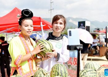 Read moreLivestreaming anchors promote watermelons during a watermelon festivalheld in Rongjiang County, southwest China's Guizhou Province. -...
