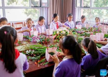 Students learn flower arrangement during an after-class activity in a primaryschool in Baotou, north China's Inner...